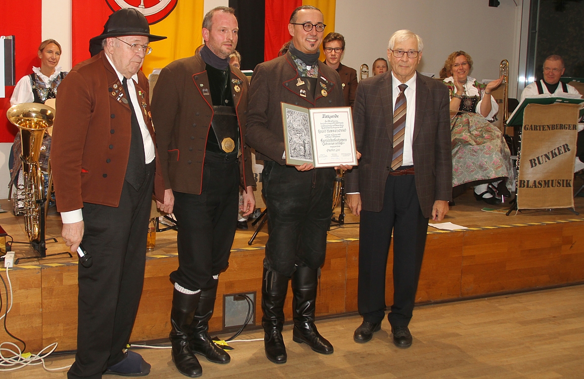 Roland Hammerschmied, sein jüngster Sohn Simon, Marius Hammerschmied, Ingrid Hammerschmied sowie der Bundesvüarstäiha des Bundes der Egerländer Gmoin Volker Jobst. (BdEG).